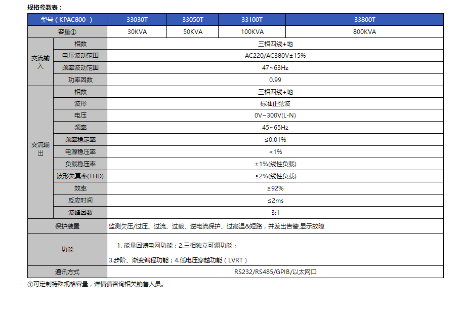 KPAC800系列具備能量回饋功能,可將能量回饋至電網(wǎng),節(jié)省能源及降低整體的購置成本。內(nèi)建的低電壓穿越功能(LVRT),用戶可以輕松模擬各法規(guī)的相關(guān)電壓跌落曲線,通過步階、漸變的編程功能可設(shè)定連續(xù)或階段式的電壓及頻率變動(dòng)。三相獨(dú)立可調(diào)功能可獨(dú)立調(diào)整各相的電壓,適用于多臺(tái)單相負(fù)載相位可調(diào)功能,可設(shè)定三相之間相位角度。