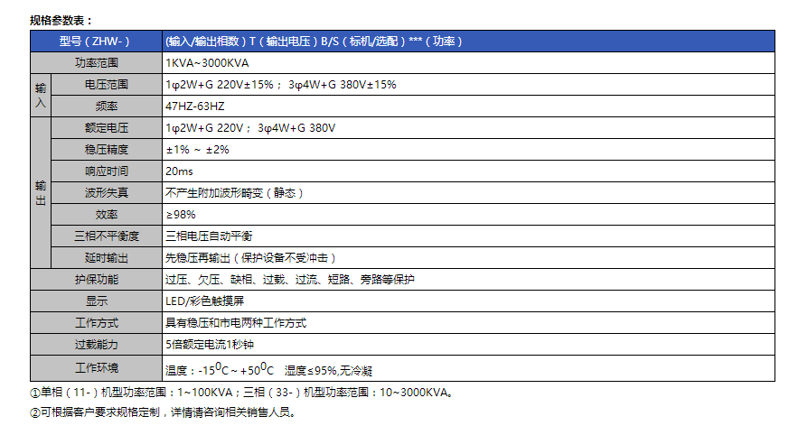 描述: ZHW系列無觸點(diǎn)感應(yīng)式交流穩(wěn)壓電源是一款采用DSP控制電磁開關(guān)矩陣的泛用型、高性能穩(wěn)壓電源。本系列穩(wěn)壓電源通過改變補(bǔ)償變壓器主回路與補(bǔ)償回路電磁耦合的大小,控制穩(wěn)壓電源輸出端的電壓,其具備優(yōu)異的過載能力,適配于沖擊性強(qiáng)、且頻繁的感性負(fù)載,能承受啟動(dòng)時(shí)瞬間5倍大電流,該功率范圍涵蓋1~3000KVA。