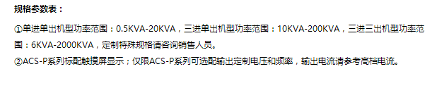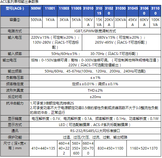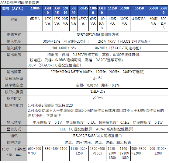 • 可定制寬電壓范圍、寬頻率范圍輸入,輸出可做定值(220V、380V可定制特殊電壓值)輸出(ACS-T系列)。