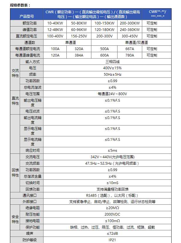 CWR系列可編程高精度智能雙向直流電源,其直流輸出特性具有完全電氣隔離、高精度、高動(dòng)態(tài)響應(yīng)及高可靠性等特性,并具有智能雙向能量轉(zhuǎn)換和可向電網(wǎng)回饋能量功能,DC/DC側(cè)采用載波移相電路,全數(shù)字控制,調(diào)節(jié)精度高,響應(yīng)速度快,輸出調(diào)節(jié)范圍廣。輸出具有可編程功能,可適用于新能源汽車行業(yè)的驅(qū)動(dòng)電機(jī)、電機(jī)控制器、PCS(儲(chǔ)能電池組)和雙向充電機(jī)的測試及老化供電等。